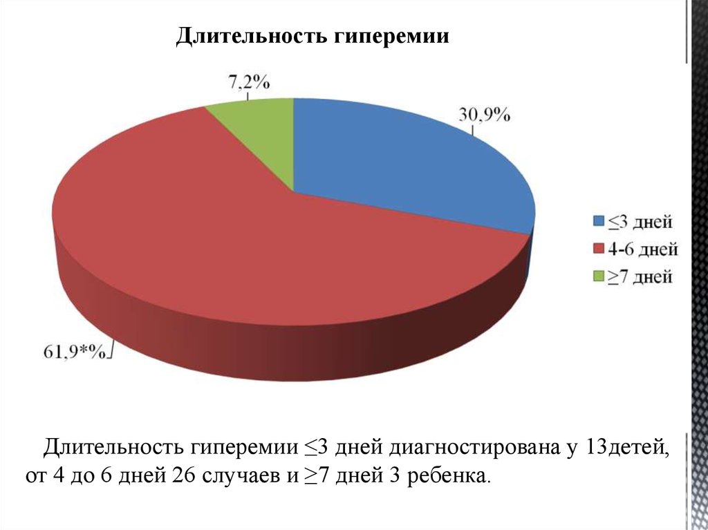 Длительность гиперемииДлительность гиперемии ≤3 дней диагностирована у 13детей,