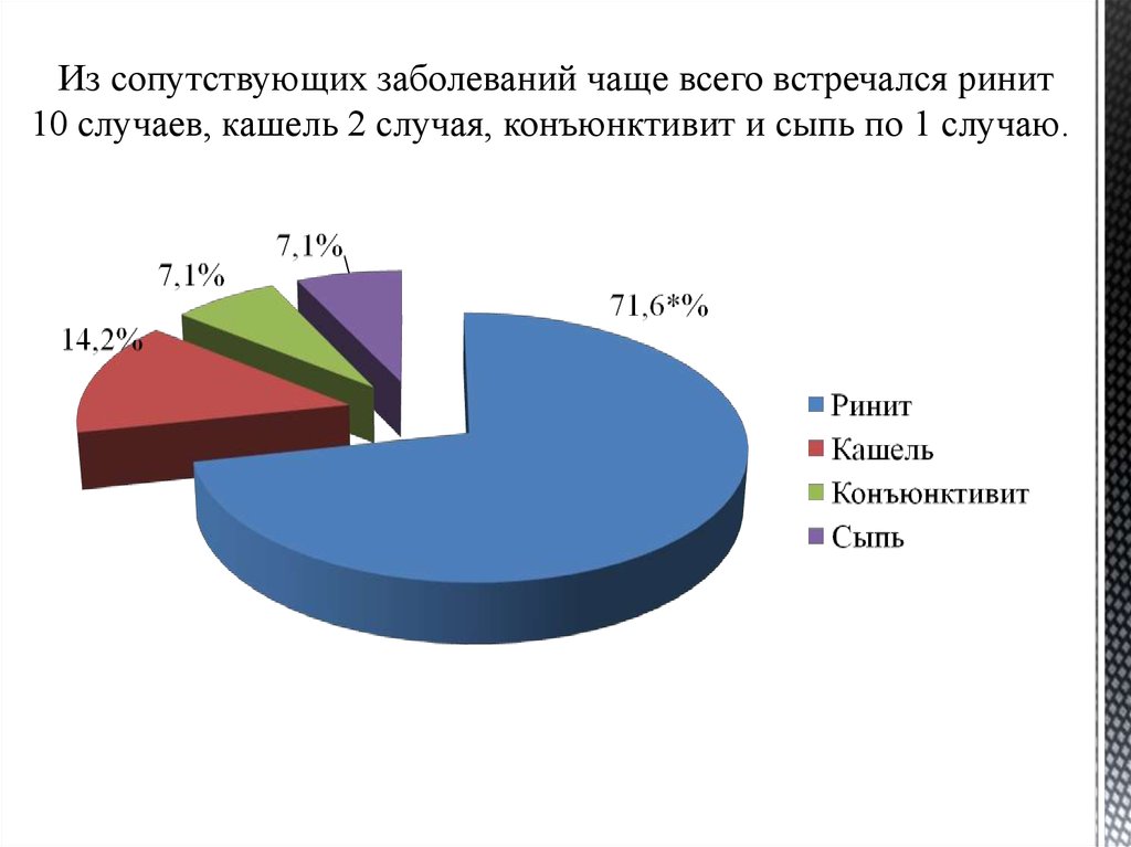 Из сопутствующих заболеваний чаще всего встречался ринит10 случаев, кашель 2 случая, конъюнктивит и сыпь по 1 случаю.