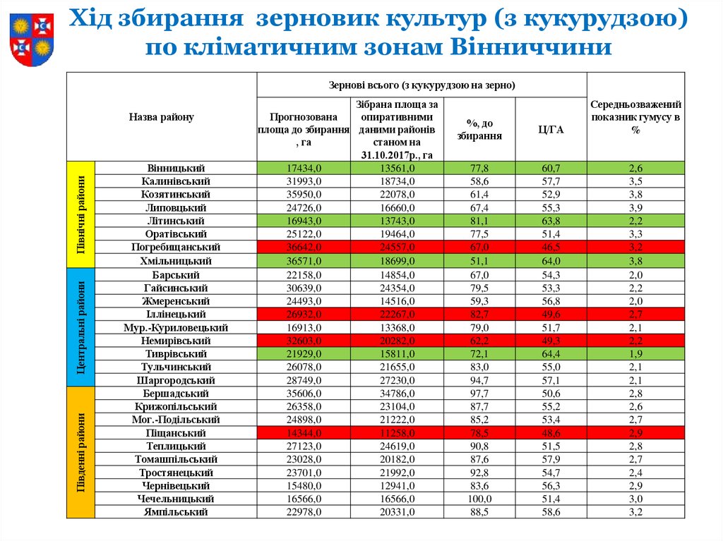 Хід збирання зерновик культур (з кукурудзою)по кліматичним зонам Вінниччини