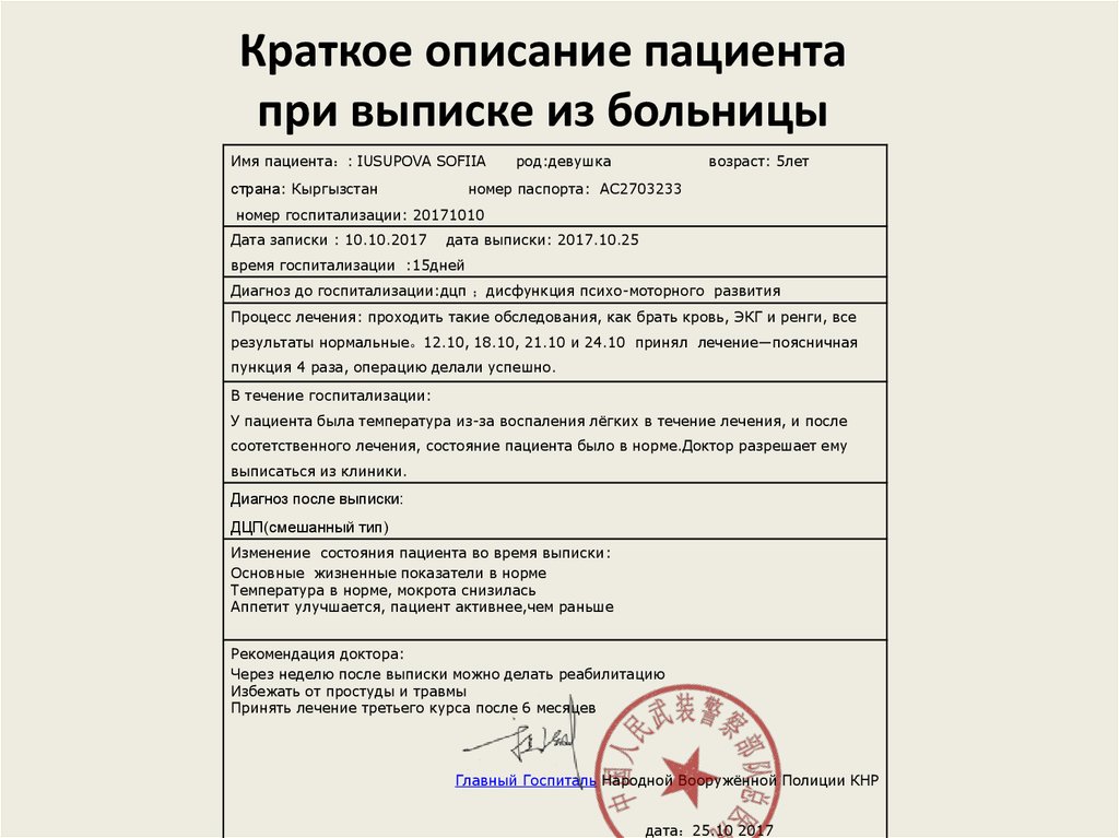 Пациента приняли на лечение в Главном Государственном госпитале народной вооружённой полиции 10