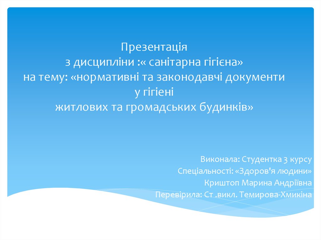 1. Презентація з дисципліни :« санітарна гігієна» на тему: «нормативні та законодавчі документи у гігіені житлових та громадських