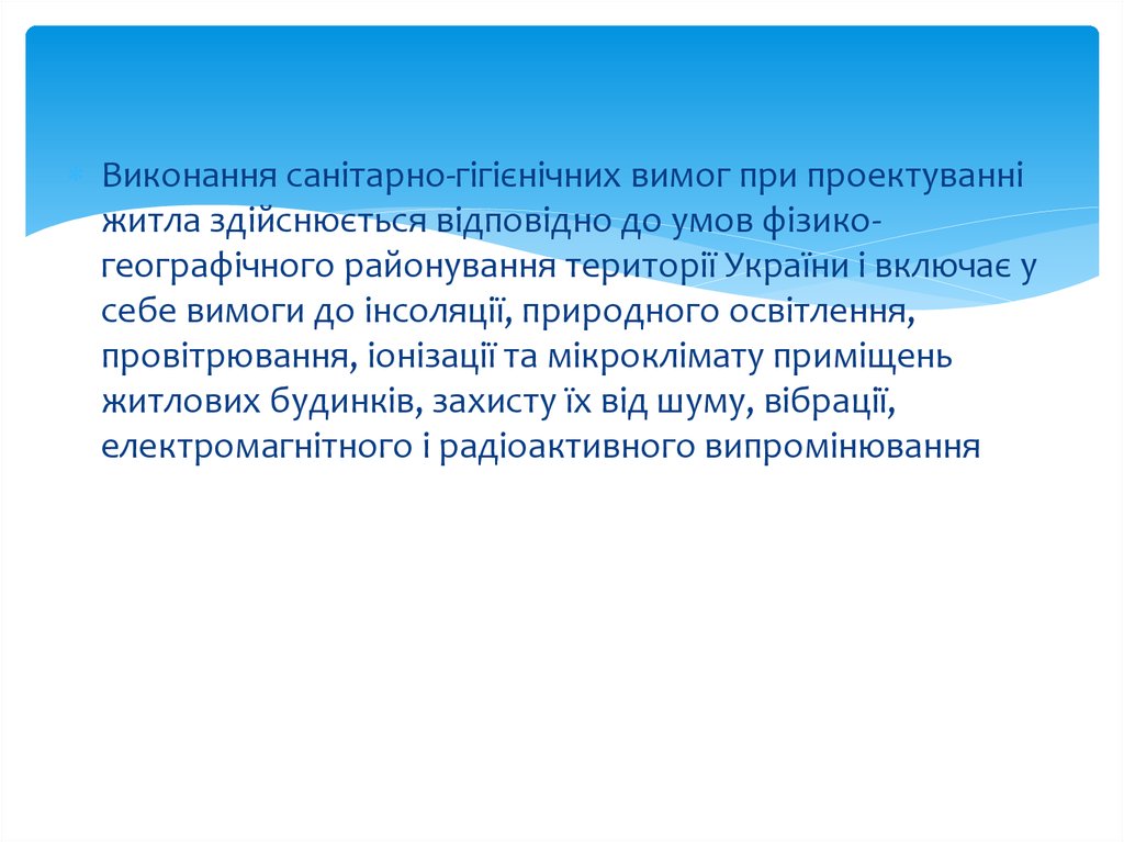 Виконання санітарно-гігієнічних вимог при проектуванніжитла здійснюється відповідно до умов фізикогеографічного районування території України і включає у