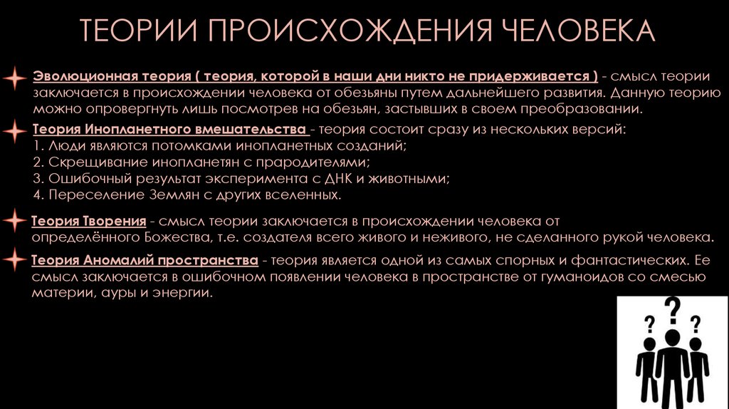 ТЕОРИИ ПРОИСХОЖДЕНИЯ ЧЕЛОВЕКАЭволюционная теория ( теория, которой в наши дни никто не придерживается ) - смысл теории