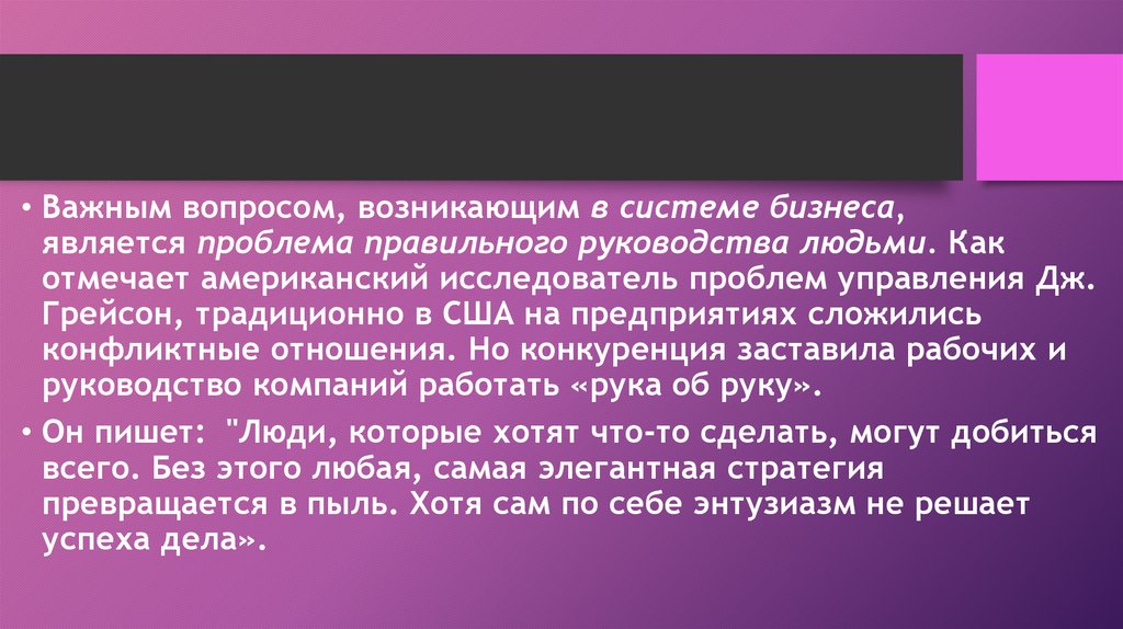 • Важным вопросом, возникающим в системе бизнеса,является проблема правильного руководства людьми. Как