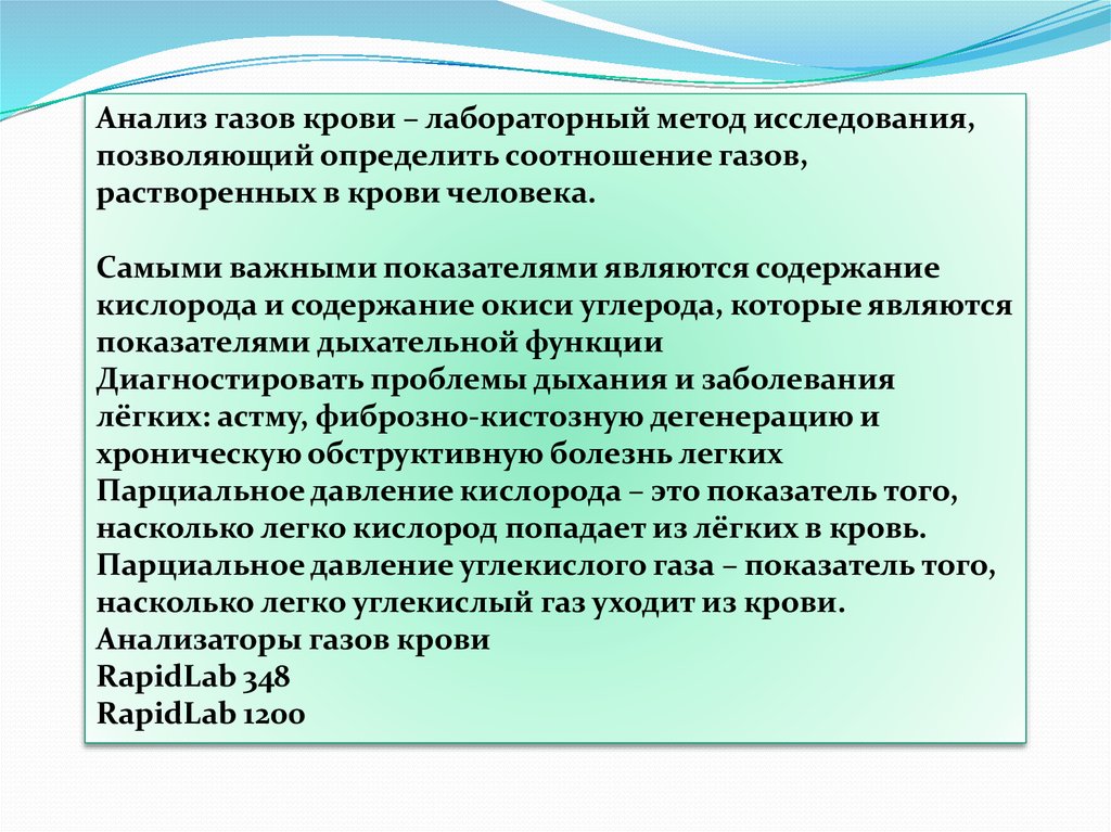 Анализ газов крови – лабораторный метод исследования,позволяющий определить соотношение газов,