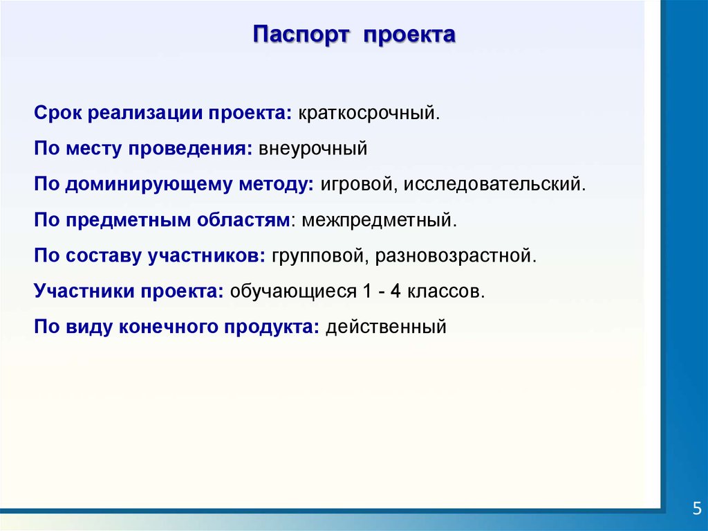 Паспорт проектаСрок реализации проекта: краткосрочный.