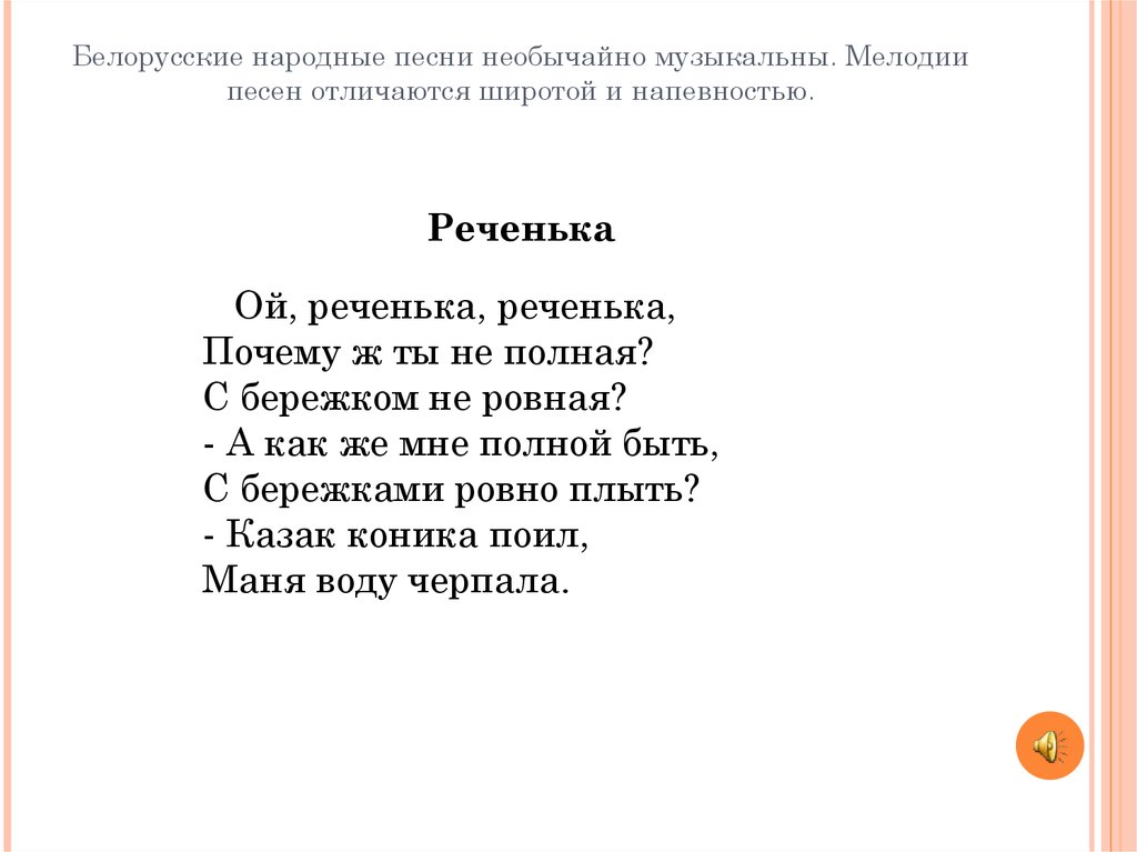 Белорусские народные песни необычайно музыкальны. Мелодиипесен отличаются широтой и напевностью.