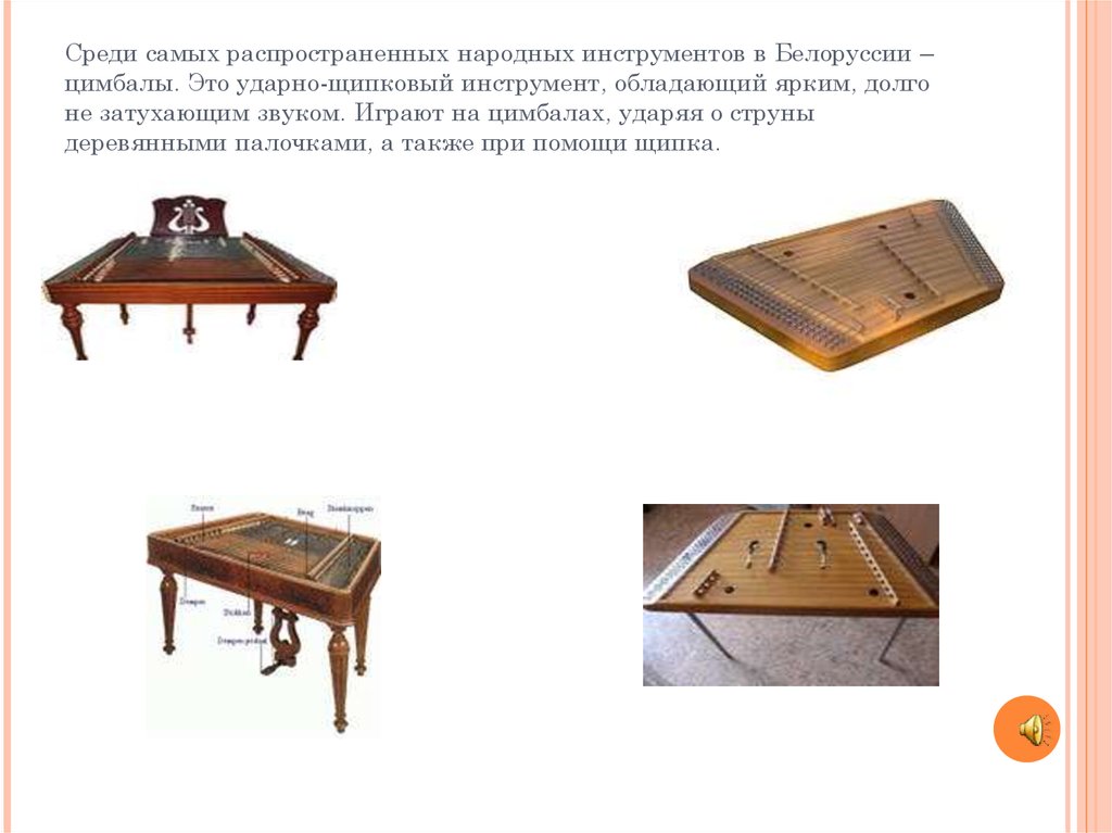 Среди самых распространенных народных инструментов в Белоруссии –цимбалы. Это ударно-щипковый инструмент, обладающий ярким, долго