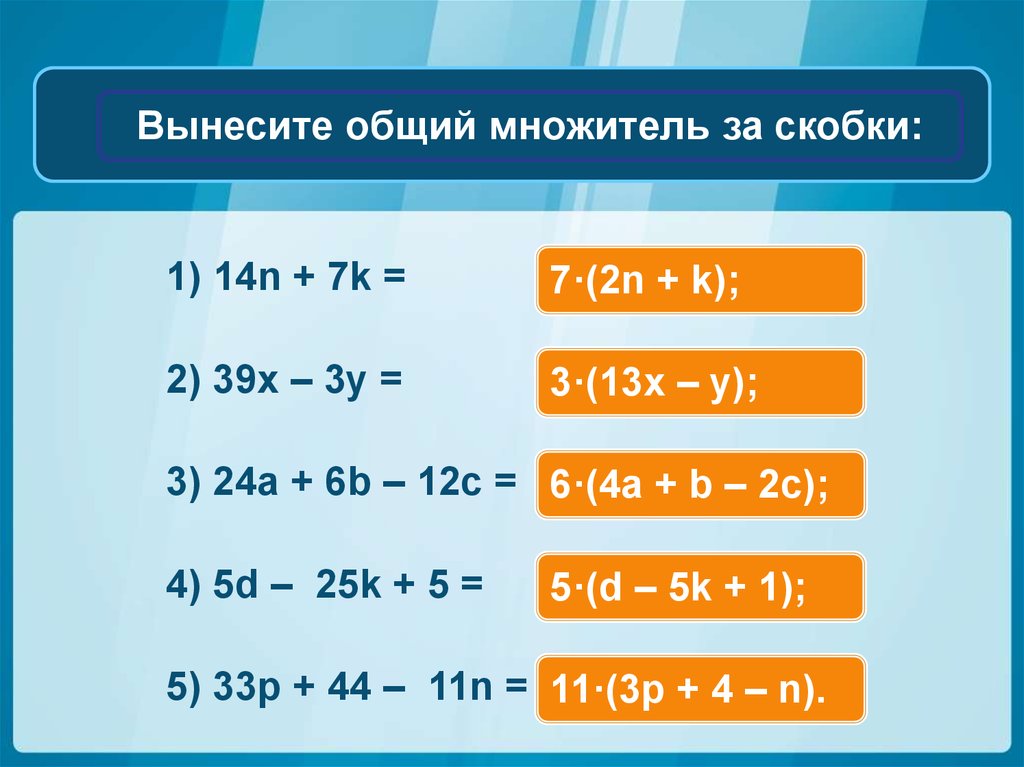 Вынесите общий множитель за скобки:1) 14n + 7k =
