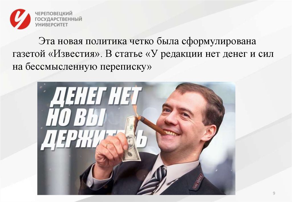 Эта новая политика четко была сформулированагазетой «Известия». В статье «У редакции нет денег и сил