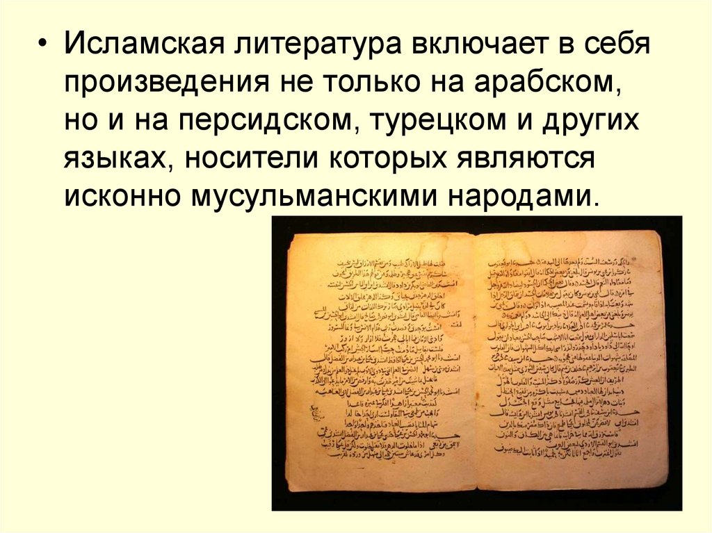 • Исламская литература включает в себяпроизведения не только на арабском,