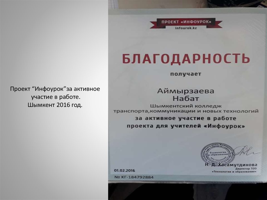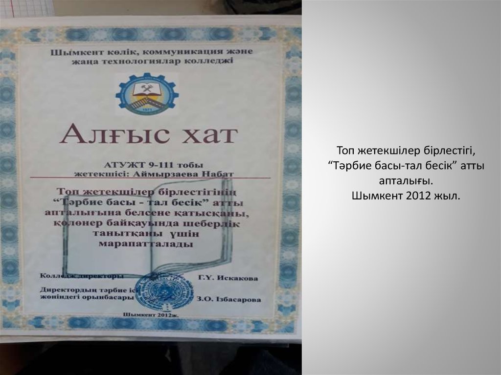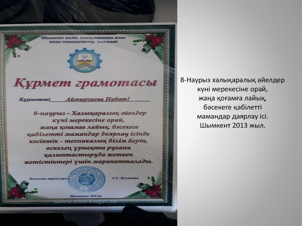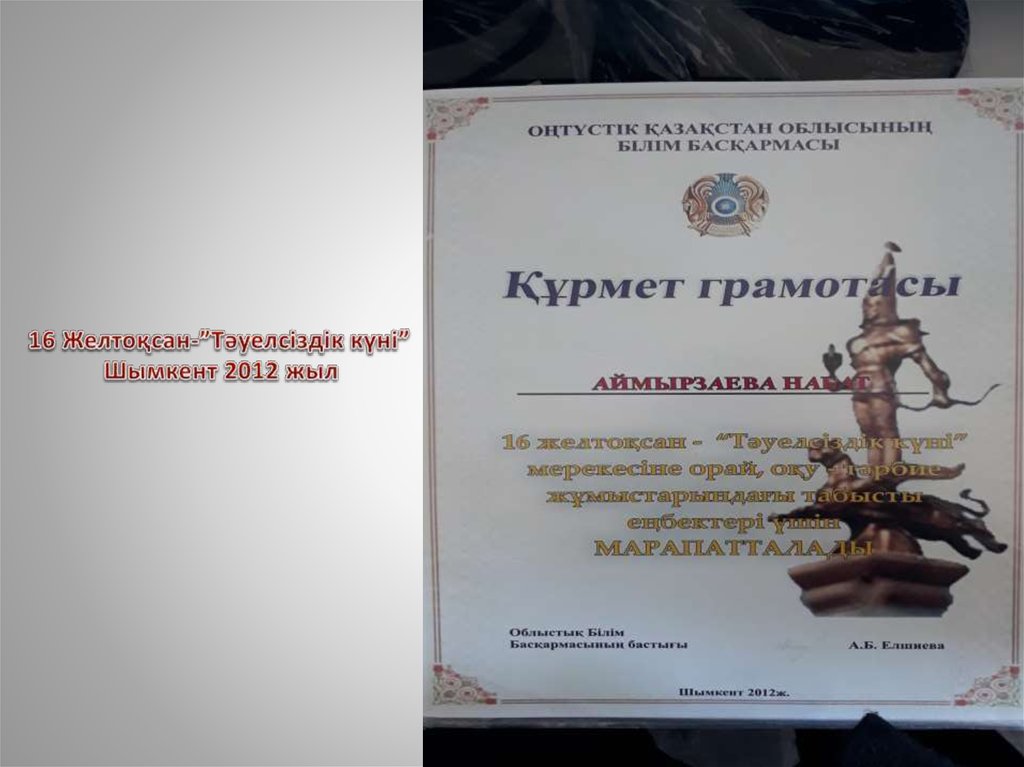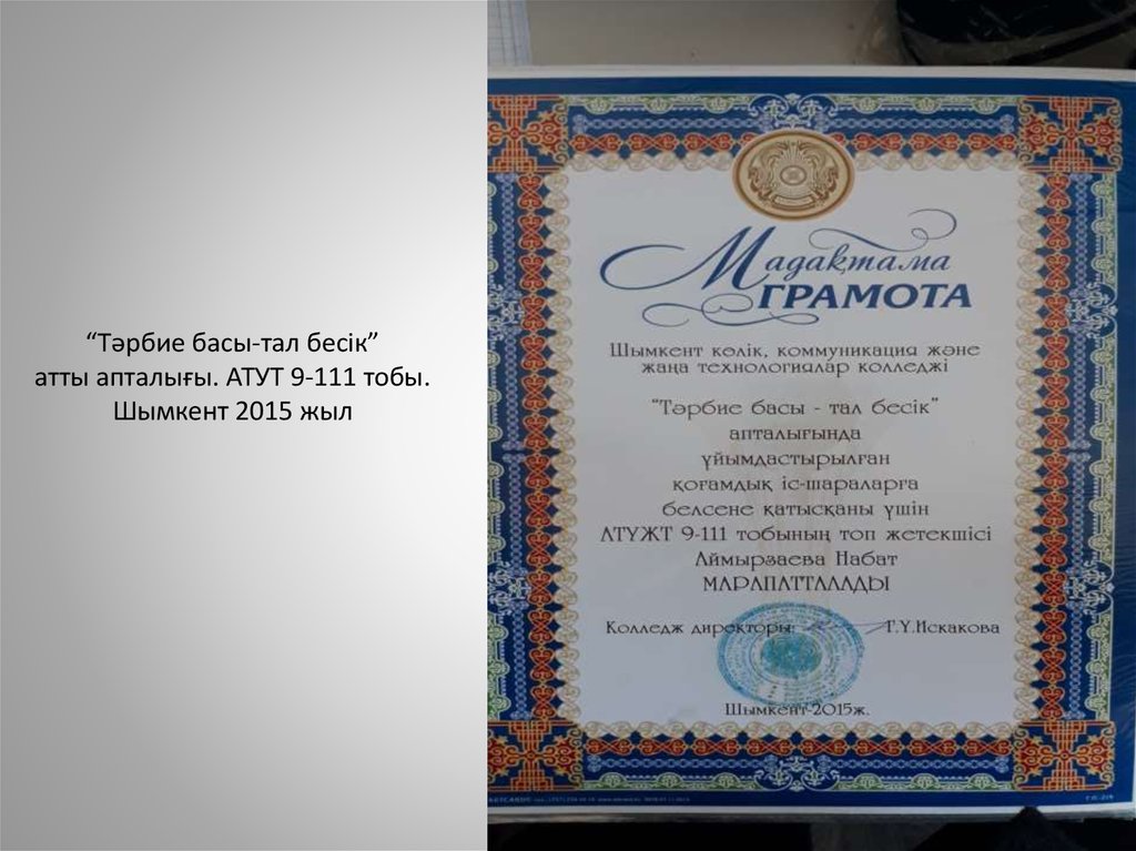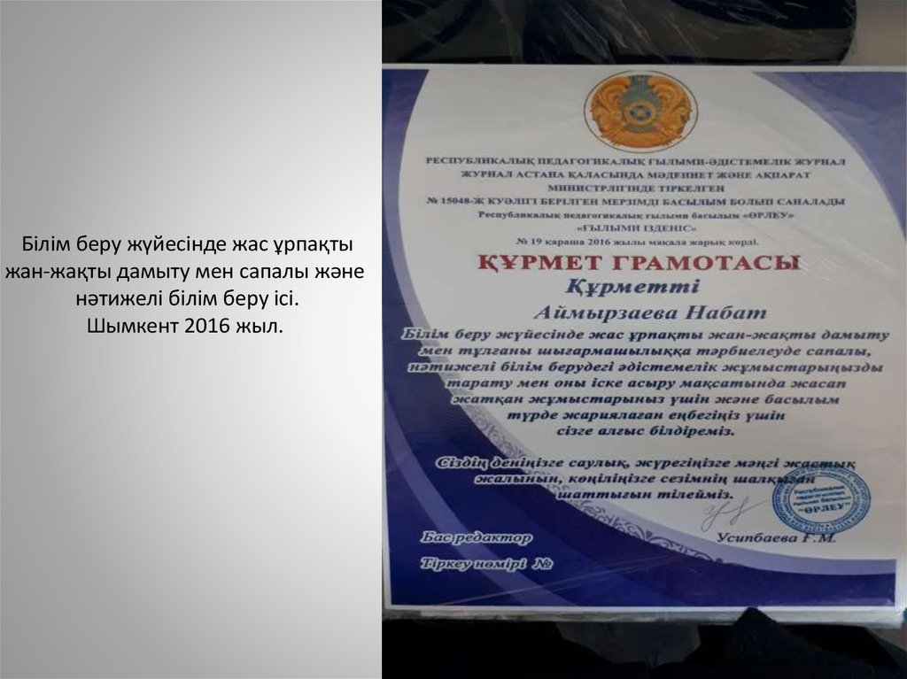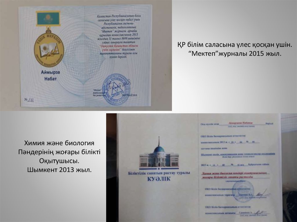 ҚР білім саласына үлес қосқан ушін.“Мектеп”журналы 2015 жыл.