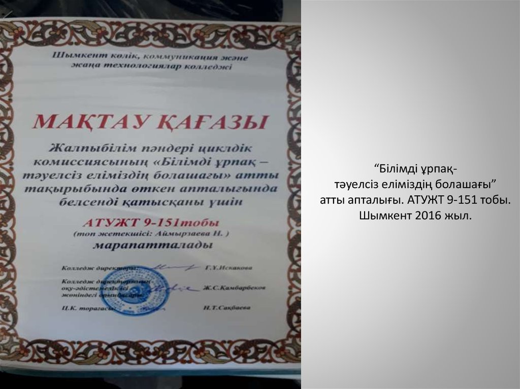 “Білімді ұрпақтәуелсіз еліміздің болашағы”атты апталығы. АТУЖТ 9-151 тобы.