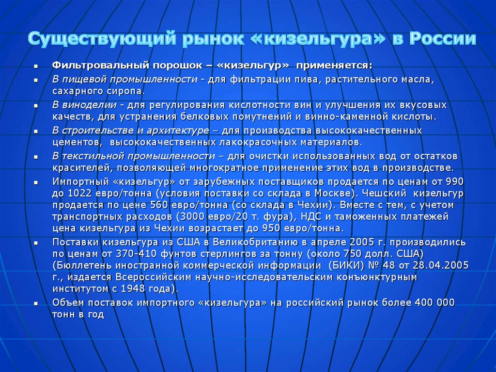 рынка «кизельгура». Освоение поставок продукции на экспорт.