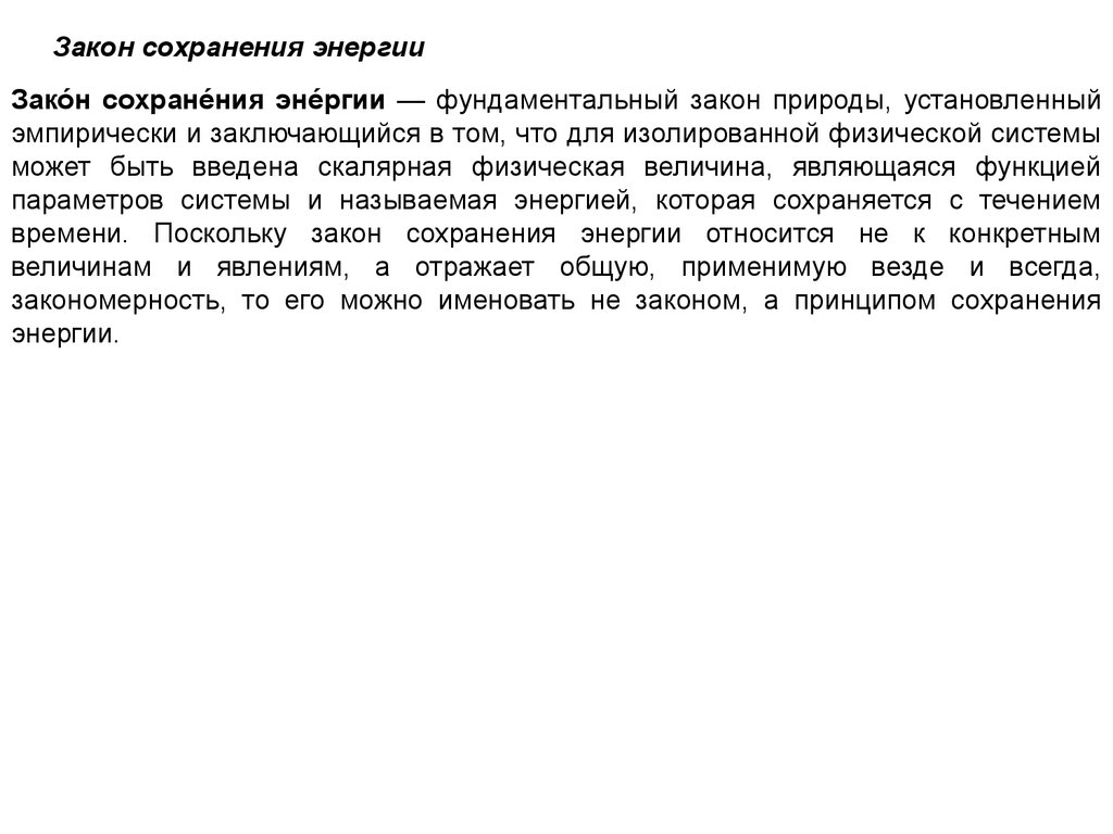 Закон сохранения энергииЗакоин сохранеиния энеиргии — фундаментальный закон природы, установленный