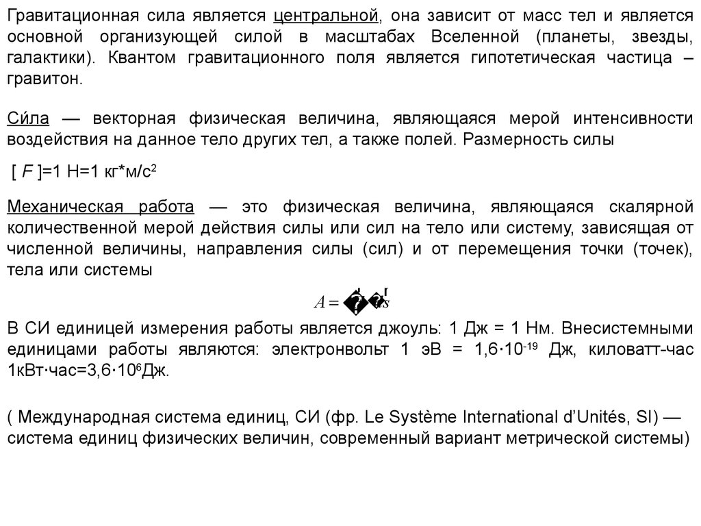 Гравитационная сила является центральной, она зависит от масс тел и являетсяосновной организующей силой в масштабах Вселенной (планеты, звезды,