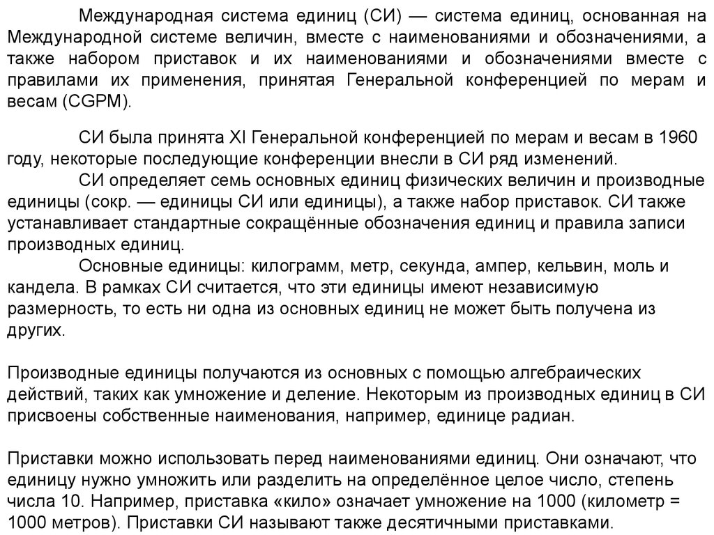 Международная система единиц (СИ) — система единиц, основанная наМеждународной системе величин, вместе с наименованиями и обозначениями, а