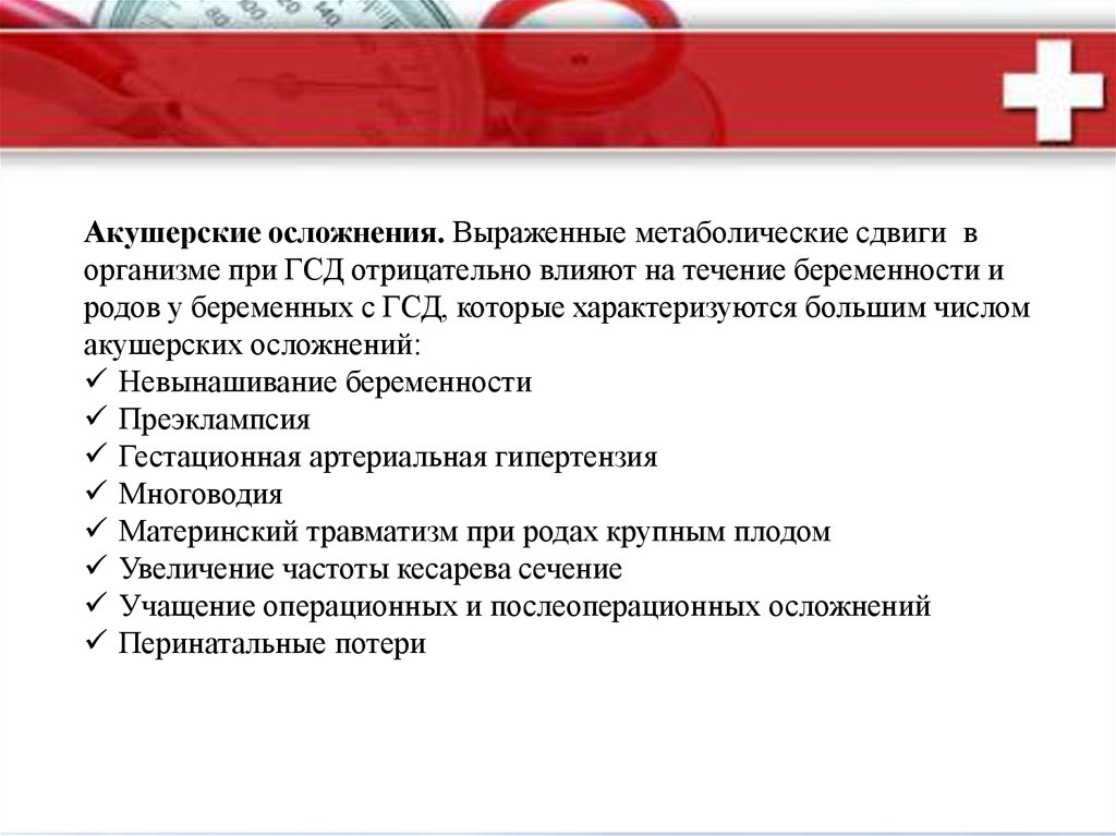 Акушерские осложнения. Выраженные метаболические сдвиги ворганизме при ГСД отрицательно влияют на течение беременности и