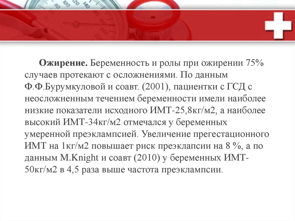 данным M.Knight и соавт (2010) у беременных ИМТ50кг/м2 в 4,5 раза выше частота преэклампсии.
