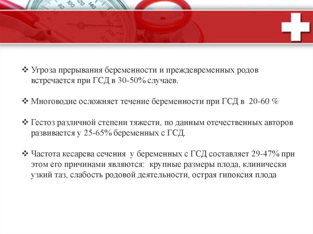Угроза прерывания беременности и преждевременных родоввстречается при ГСД в 30-50% случаев.