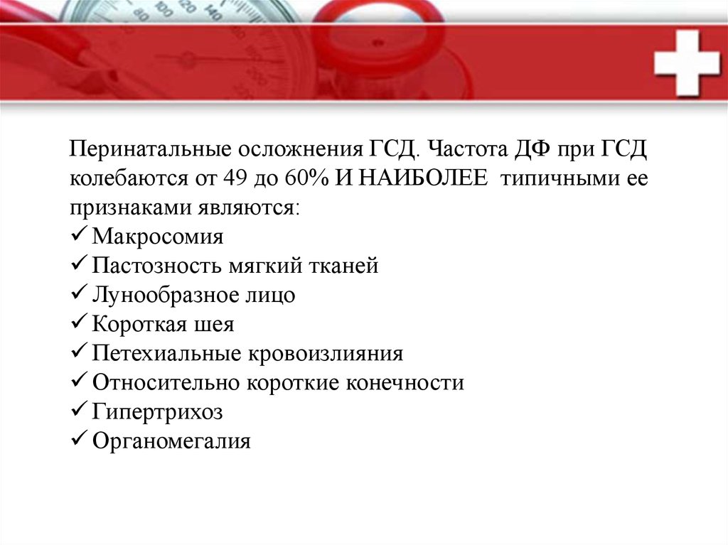 Перинатальные осложнения ГСД. Частота ДФ при ГСДколебаются от 49 до 60% И НАИБОЛЕЕ типичными ее
