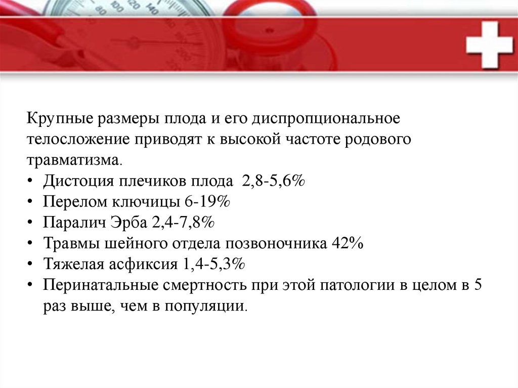 Крупные размеры плода и его диспропциональноетелосложение приводят к высокой частоте родового