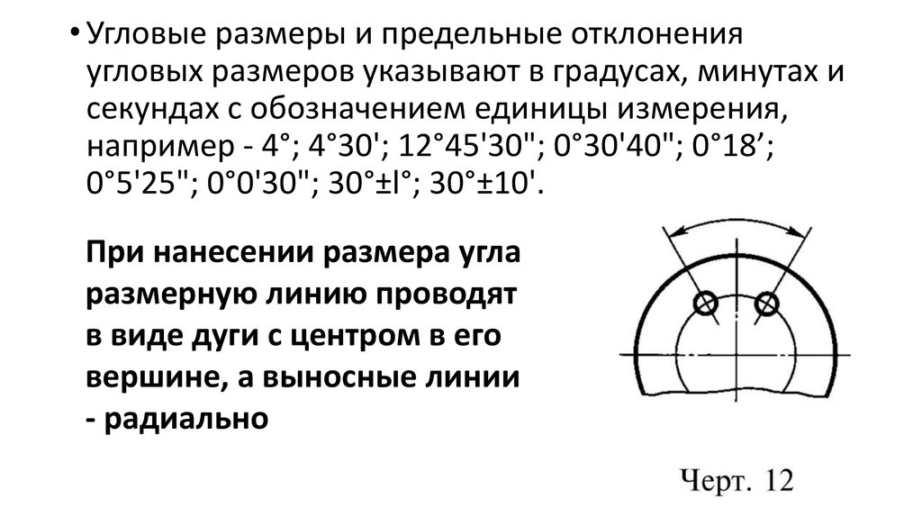 • Угловые размеры и предельные отклоненияугловых размеров указывают в градусах, минутах и