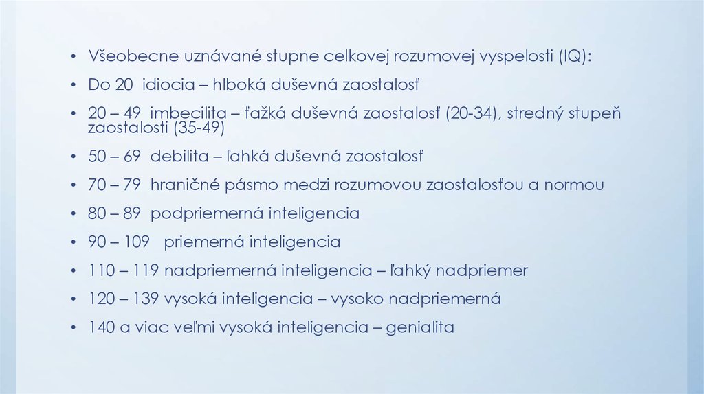 • Všeobecne uznávané stupne celkovej rozumovej vyspelosti (IQ):• Do 20 idiocia – hlboká duševná zaostalosť