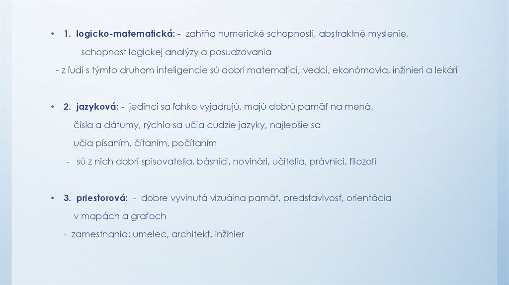 1. logicko-matematická: - zahŕňa numerické schopnosti, abstraktné myslenie,