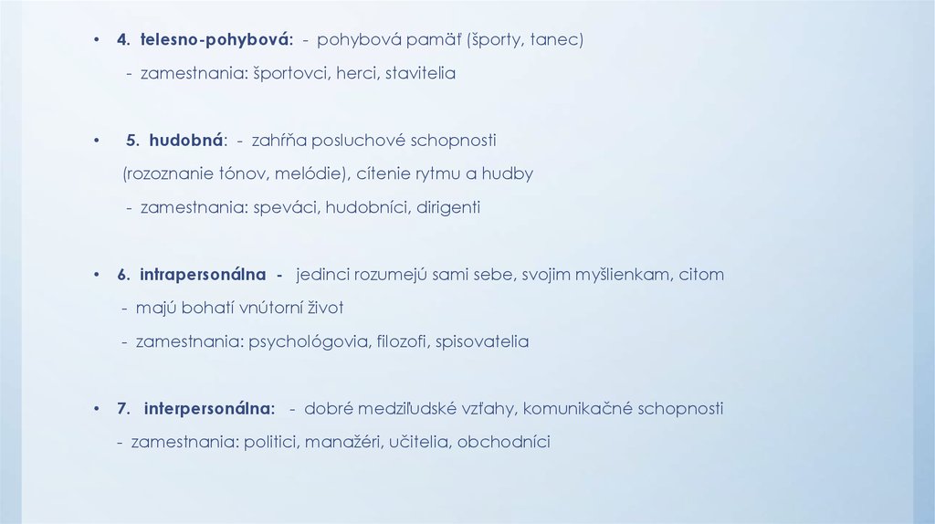 2. jazyková: - jedinci sa ľahko vyjadrujú, majú dobrú pamäť na mená,