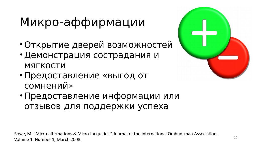Rowe, M. “Micro-affirmations & Micro-inequities.” Journal of the International Ombudsman Association,