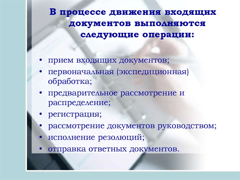В процессе движения входящихдокументов выполняются