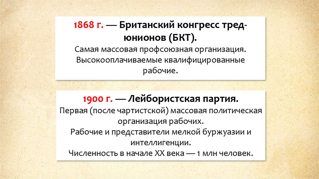 1868 г. — Британский конгресс тредюнионов (БКТ).Самая массовая профсоюзная организация.