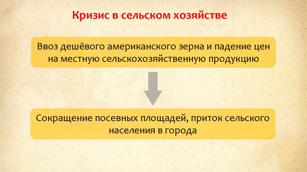 Кризис в сельском хозяйствеВвоз дешёвого американского зерна и падение цен
