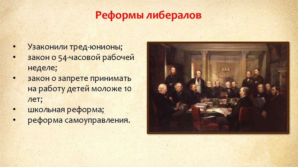 Реформы либераловУзаконили тред-юнионы;