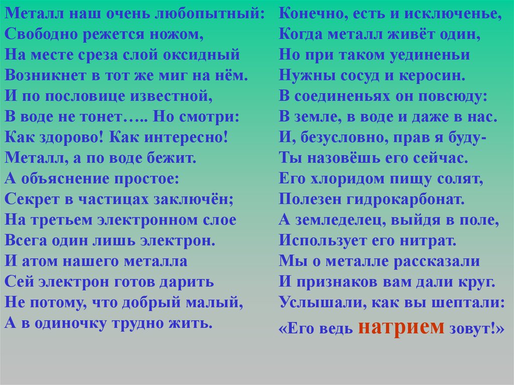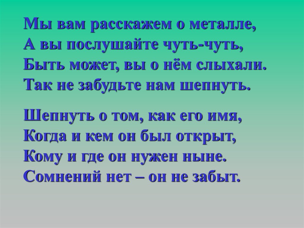 Мы вам расскажем о металле,А вы послушайте чуть-чуть,