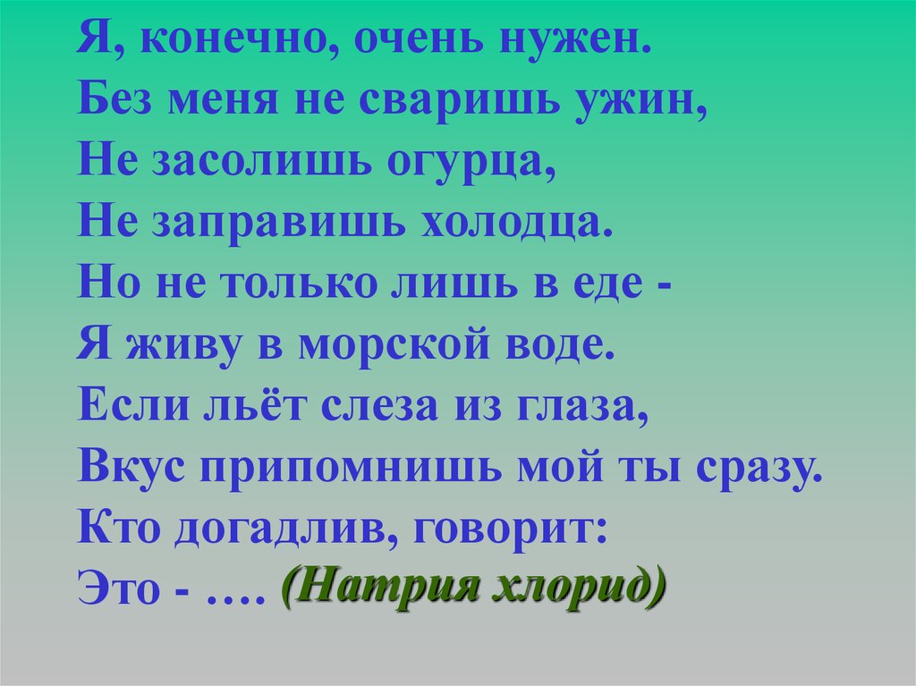 Это - …. (Натрия хлорид)