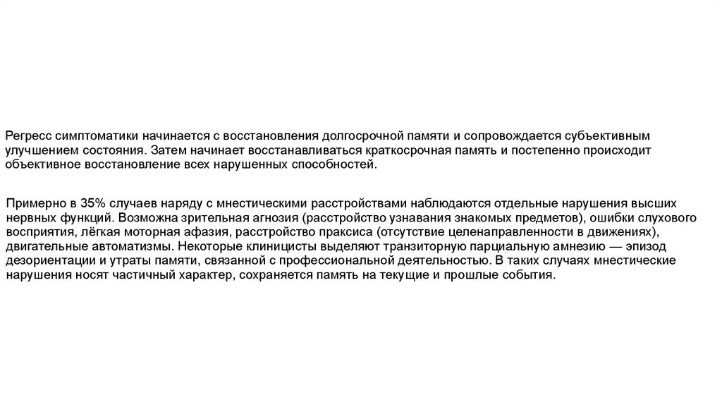 Регресс симптоматики начинается с восстановления долгосрочной памяти и сопровождается субъективнымулучшением состояния. Затем начинает восстанавливаться краткосрочная память и постепенно происходит