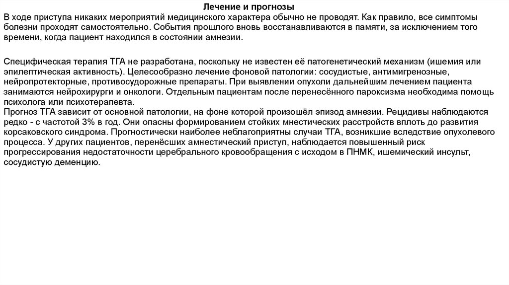 корсаковского синдрома. Прогностически наиболее неблагоприятны случаи ТГА, возникшие вследствие опухолевого