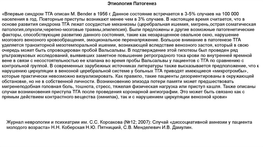 Этиология Патогенез«Впервые синдром ТГА описан М. Bender в 1956 г. Данное состояние встречается в 3-5% случаев на 100 000