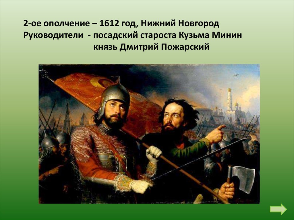 2-ое ополчение – 1612 год, Нижний НовгородРуководители - посадский староста Кузьма Минин