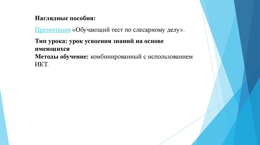 Наглядные пособия:Презентация «Обучающий тест по слесарному делу».