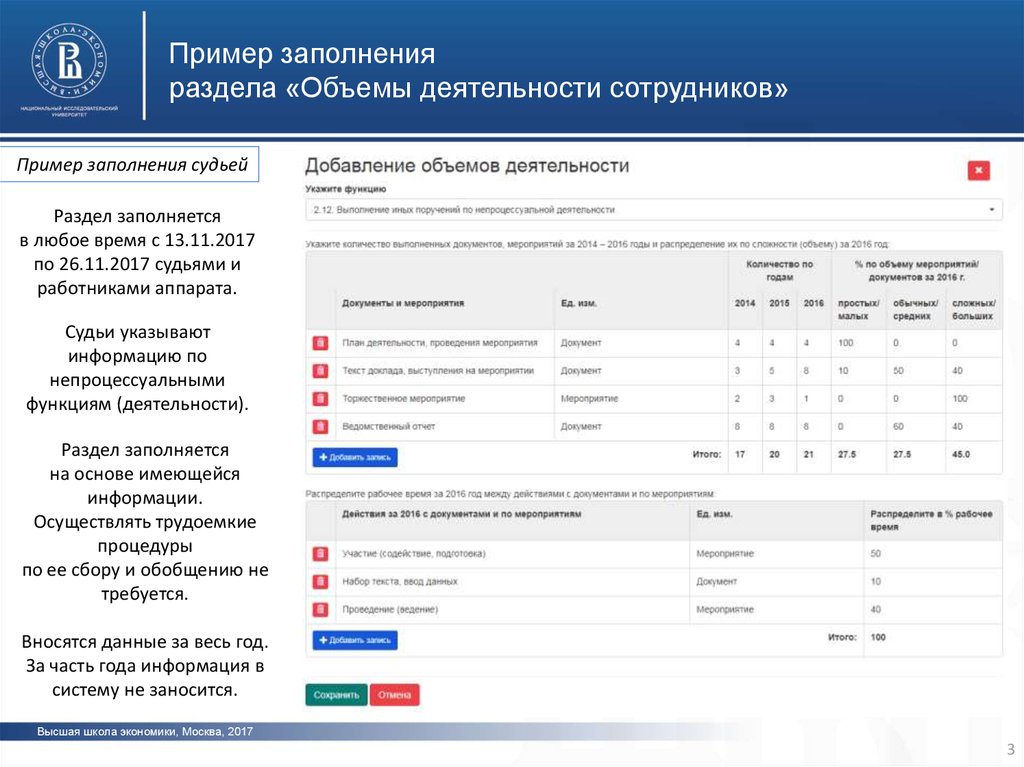 Пример заполненияраздела «Объемы деятельности сотрудников»