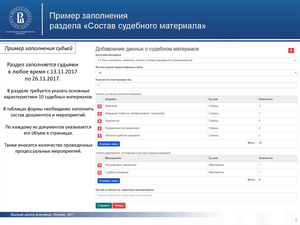 судебного материала в разрезе документов и мероприятий. Раздел заполняется