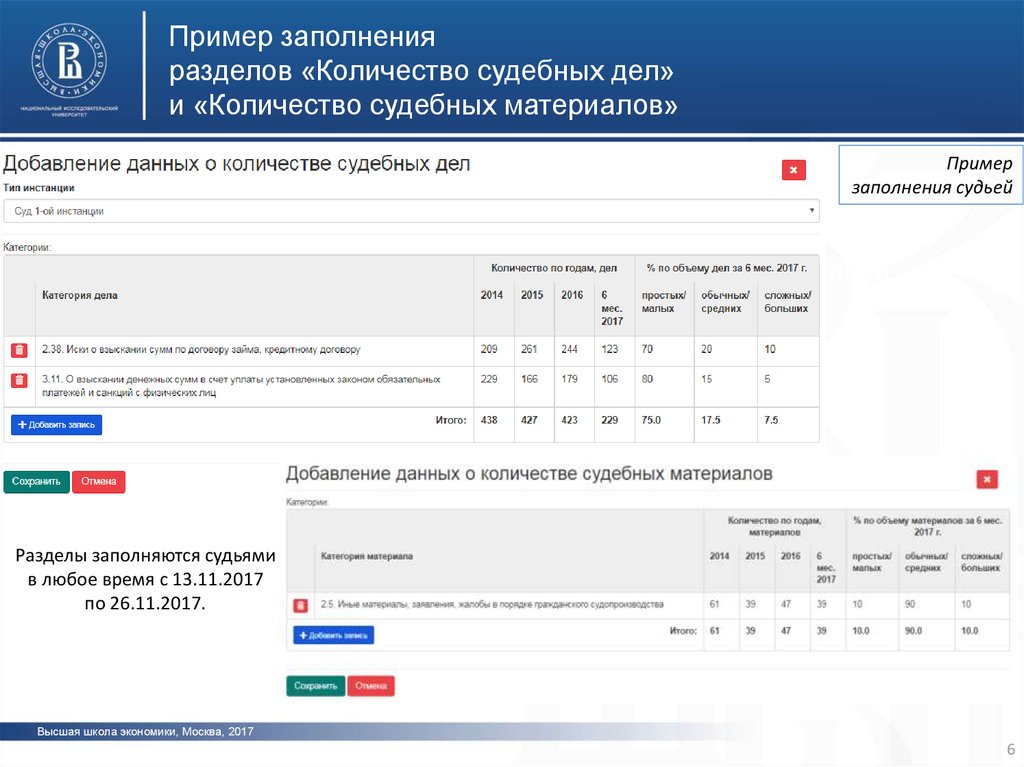 «Количество судебных материалов». Раздел разработан для сбора информации