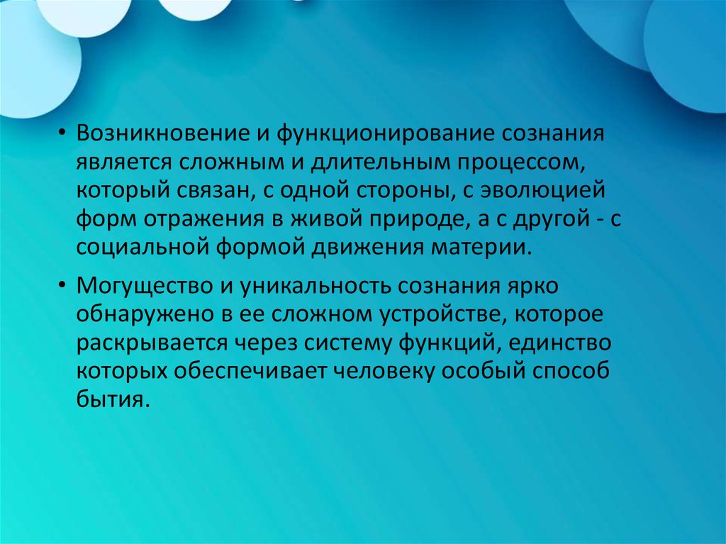 • Возникновение и функционирование сознанияявляется сложным и длительным процессом,