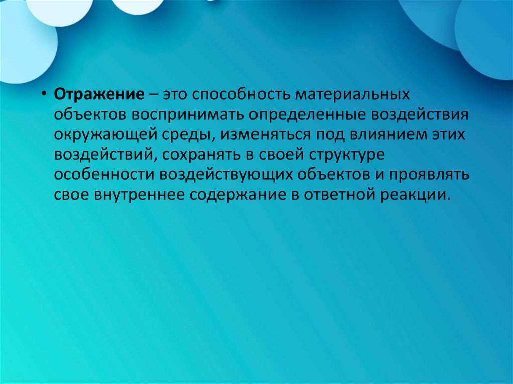 • Отражение – это способность материальныхобъектов воспринимать определенные воздействия