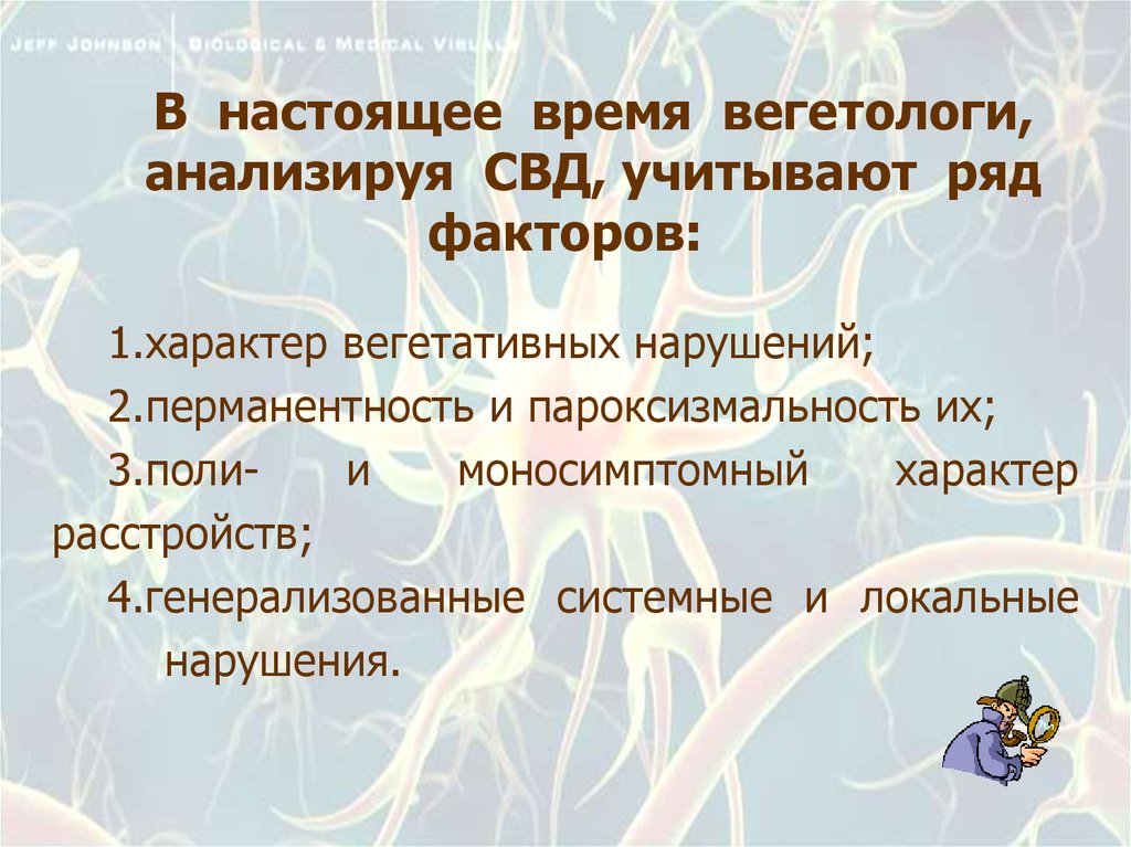 В настоящее время вегетологи,анализируя СВД, учитывают ряд