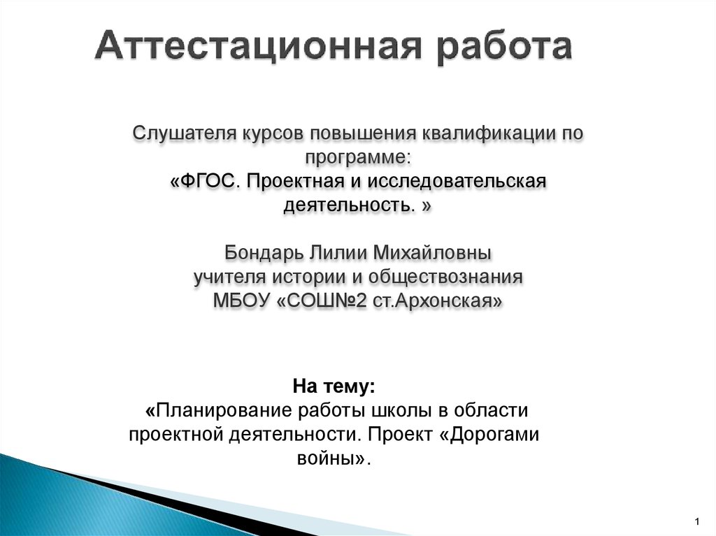 Аттестационная работа. Планирование работы школы в области проектной деятельности. Проект «Дорогами войны»