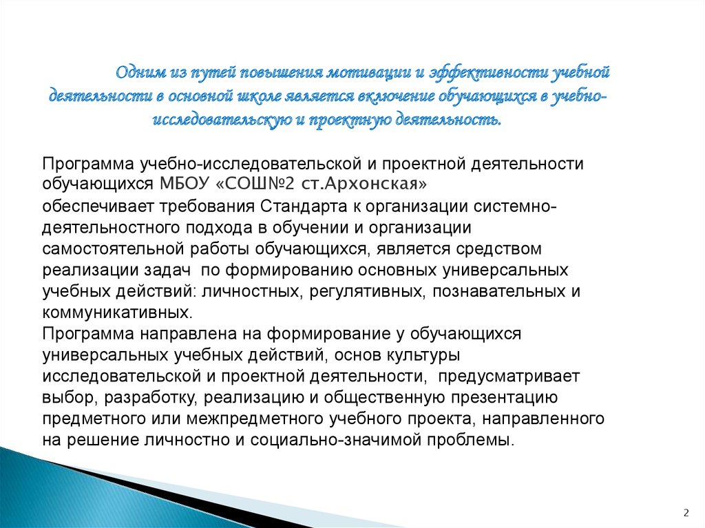 Одним из путей повышения мотивации и эффективности учебнойдеятельности в основной школе является включение обучающихся в учебноисследовательскую и проектную деятельность.